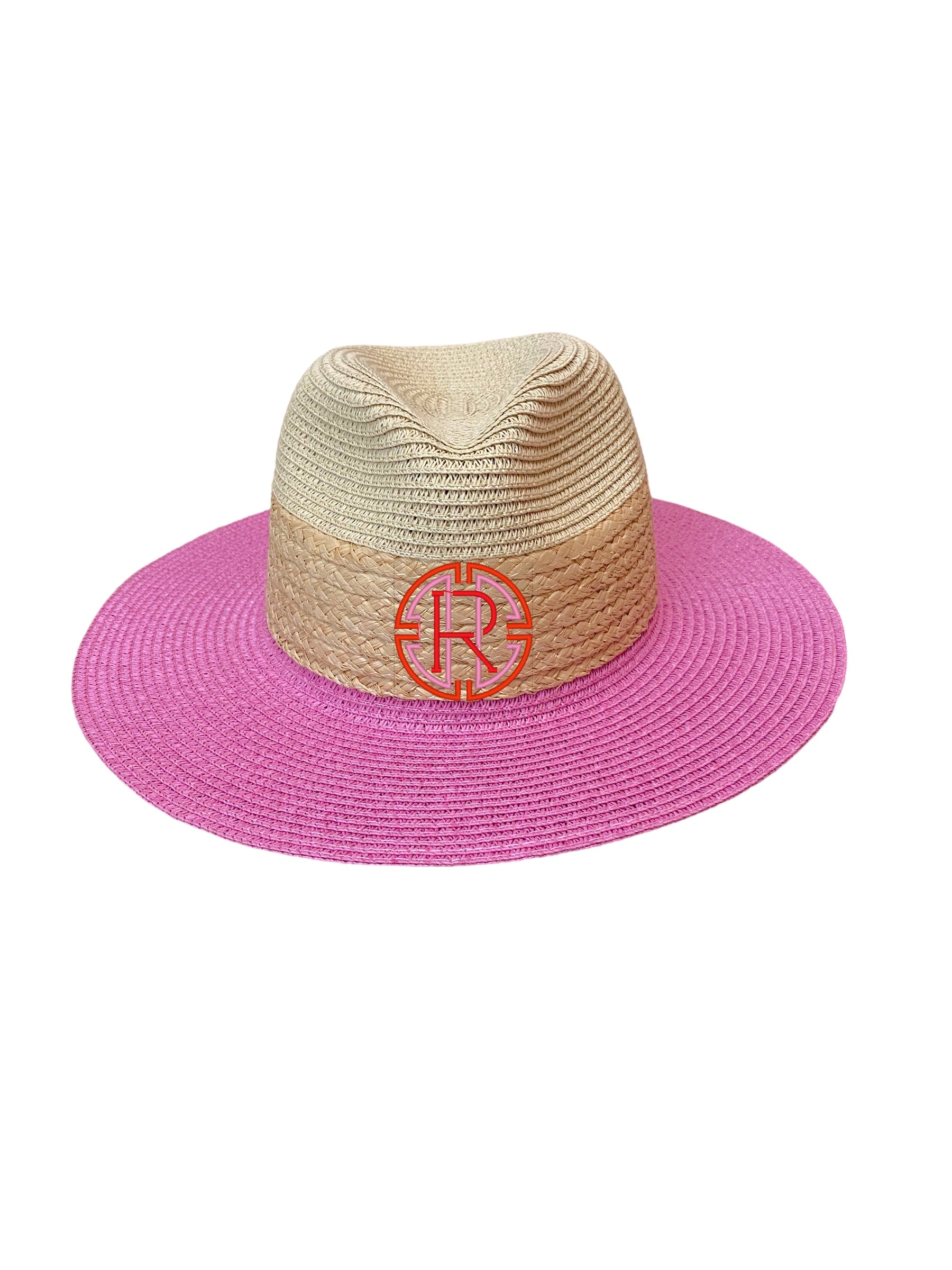A Classic fedora brim hat with a fun twist-- pink! Structured but not overly firm, one size fits most. Add a monogram or wear it as is! Shown in our Medallion Font.