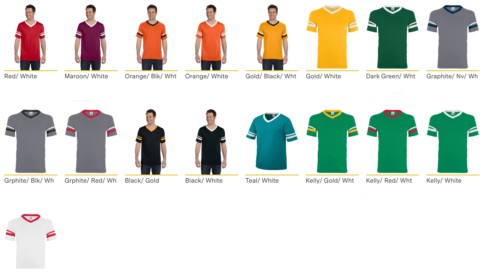 Features Contrast color 1x1 rib knit V-neck collar Two contrast color sleeve stripes Set-in sleeves Double-needle hemmed sleeves and bottom. (Also available in Youth) Retro-inspired style with updated features Fabric 50% polyester/50% cotton jersey knit Sizes S - 3XL